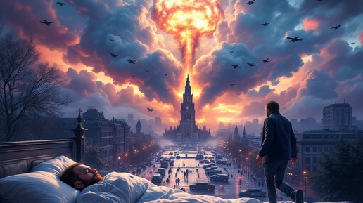 Во сне я шел по центральной площади города, когда внезапно начался шум и паника. В небе появилась гремящая военная авиация, и вдалеке раздавались взрывы от разорвавшихся бомб — на окраине города один из заводов взрывался, образуя грибовидные облака. По глупости я попытался это заснять на телефон. Вдруг на площадь ворвалась колонна БТР и других военных автомобилей, которые расстреливали мирных людей и подожгли трамвай. Я упал на асфальт, закрыв голову руками, и ощутил вкус асфальта. Это было так реально, что, проснувшись, я всё ещё чувствовал этот вкус во рту...