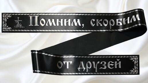 Траурная лента – необходимый элемент похоронной церемонии, который говорит о случившейся утрате. Есть короткие ленты, которыми обвязывают правый угол фотоснимка умершего. Чаще всего у такой ленты черный цвет, нет надписей. Фотография с короткой лентой считается необходимым элементом похорон. Длинные ленты применяются для вплетения в погребальный венок. Обычно они черного цвета. Иногда они могут быть синего или иного цвета. На длинную ленту наносят последние слова, пожелания для усопшего. Кроме стандартных слов можно заказать авторский текст...