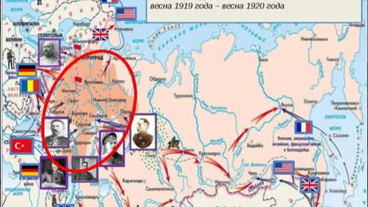 Основные участники: Красные и Белые Период: апрель 1919 года - февраль 1920 года Апрель 1919 года Действия Красных в это время: РККА начинает контрнаступление против Колчака и остановилось под Уфой Действия Белых в это время: Армия Деникина захватывает Северный Кавказ, Южную Украину и территорию Дона Лето 1919 года Действия Красных в это время: Начало августа - захват Урала. Колчак отступает вглубь Сибири Действия Белых в это время: 3 июня - приказ Деникина о походе на Москву. Захвачен Орёл, подходят...