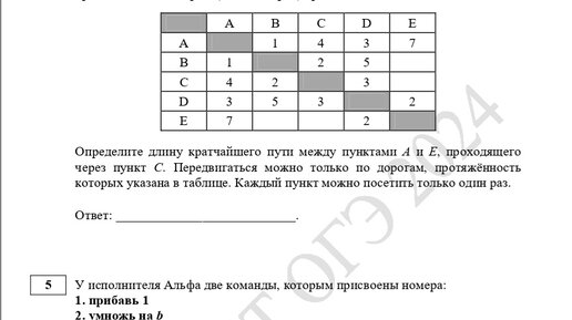 Ответы выложим у нас в телеграм–👇 Демонстрационный вариант ОГЭ 2024 г. ИНФОРМАТИКА, 9 класс. 5/33 4 Между населёнными пунктами А, В, С, D, Е построены дороги, протяжённость которых (в километрах) приведена в таблице. A B 1 C D E A 4 3 7 B C 2 5 4 3 7 2 5 3 2 D E 1 3 2 Определите длину кратчайшего пути между пунктами А и Е, проходящего через пункт С. Передвигаться можно только по дорогам, протяжённость которых указана в таблице. Каждый пункт можно посетить только один раз...