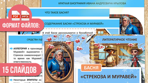 Презентация создана по теме басни И.А. Крылова «Стрекоза и Муравей». Материал подготовлен специально к уроку Литературного чтения во 2 классе. Презентация состоит из 15 слайдов, представлена в PDF-формате и PPTX-формате (можно редактировать). Содержание презентации по слайдам: Слайд 1. Тема: Басня И.А. Крылова «Стрекоза и Муравей». Слайд 2. Краткая биография Ивана Андреевича Крылова. Слайд 3. Что такое басня? Слайд 4. История создания басни «Стрекоза и Муравей». Слайд 5. Краткое содержание басни «Стрекоза и Муравей»...