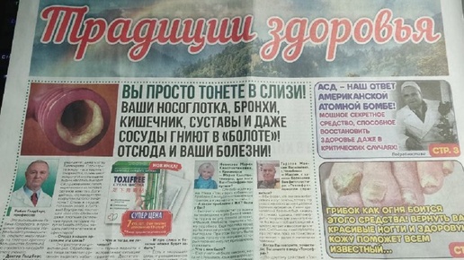 «Вы просто тонете в слизи! Отсюда и ваши болезни!» - прямо орёт заголовком то ли газетка, то ли листовка с названием «Традиции здоровья», которую бесплатно разбрасывают по почтовым ящикам в городах Брестской области. Кстати, раньше эта газетка называлась «Целебник». Так называемые контролирующие органы, особенно Мининформ РБ, избегало рассмотрения жалоб, что факт - не реагировало на нарушеня закона о СМИ. А занималось преследование м и уничтожением наястоящих и правдивых СМИ.