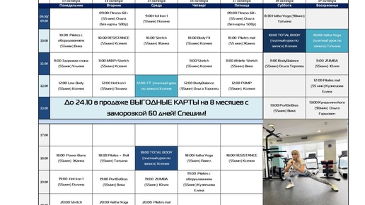 ⏩ Расписание групповых занятий с 13.10.25 по 19.10.25 И важная новость: по вашим просьбам в пятничном расписании теперь на постоянной основе активная тренировка с резинками в 18:00 с Ксенией. Добавляйте в свой план — это отличный способ прокачать силу, выносливость и тонус мышц...