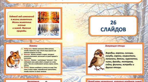Рабочий лист скачать здесь Рабочий лист можно использовать в комплекте с презентацией. Презентацию скачать здесь Рабочий лист состоит из 10 заданий. Всего три страницы: две страницы с заданиями, одна страница с ответами. Задание 1. Явления, которые наиболее характерны для осени, обведи жёлтым цветом, а наиболее характерные для зимы - синим. Задание 2. Установи соответствие с помощью линий. Задание 3. Почему некоторые животные впадают зимой в спячку? И почему многие птицы улетают на юг? Выбери правильный ответ, отметь его галочкой...