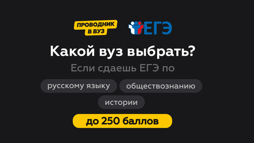 В продолжении предыдущей статьи рассмотрим, куда поступить с ЕГЭ по обществознанию и истории, имея за три экзамена более 250 баллов. Вузы, где обществознание и история являются фиксированными предметами. ВШЭ: 40.03.01 Юриспруденция. ГАУГН: 46.03.01 История ГУП (МГОУ): 44.03.05 Педагогическое образование (с двумя профилями подготовки): МГПУ: 40.03.01 Юриспруденция. МГУ им. Ломоносова: 37.03.02 Конфликтология. РГУП: 40.03.01 Юриспруденция. 40.05.03 Судебная экспертиза. 40.05.04 Судебная и прокурорская деятельность Вузы, где история является гибким предметом по выбору: ВГУЮ (РПА): 40...