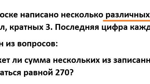 Уважаемые школьники и родители. В этому году повторилась история такая же как в 2017 году, но тогда на это обратили внимание лишь немногие. Ошибка в условии задачи в реальной версии ЕГЭ Сейчас за абсолютно правильные решения школьники могут не получить заветные баллы. Результаты еще неизвестны, но если Вы решали задачу 19 и у Вас получился ответ, отличный от авторского - обязательно идите на апелляцию. Большинство ученых-математиков и преподавателей Вас поддержат! А теперь суть вопроса. Сначала условие задачи На доске написано несколько различных натуральных чисел, кратных 3...