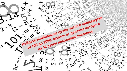 Найдите наибольшее целое число в промежутке от 100 до 1000, остаток от деления которого на 42 равен неполному частному. Задача предлагалась на репетиционном тестировании по математике в 2016-17 гг. на первом этапе под номером В5. Вспомним формулу деления с остатком. Если a и b — целые числа,...