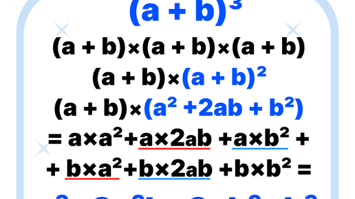 Привет! Если с формулами вроде (a + b)² и a² - b² ты уже разобрался и чувствуешь себя уверенно — отлично! Самое время двигаться дальше. Сегодня на очереди объёмные формулы: куб суммы, куб разности, сумма и разность кубов. 1. Куб суммы Формула: (a + b)³ = a³ + 3a²b + 3ab² + b³ Как запомнить: