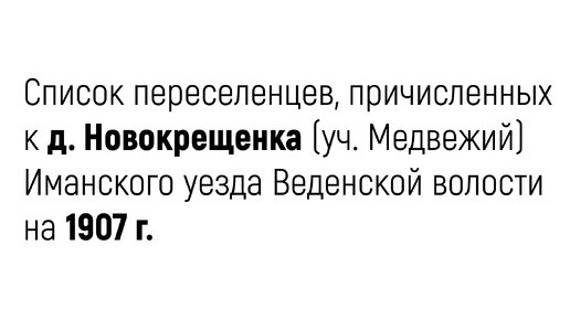 Список переселенцев, причисленных к д. Новокрещенка (уч. Медвежий) Иманского уезда Веденской волости на 1907 г.