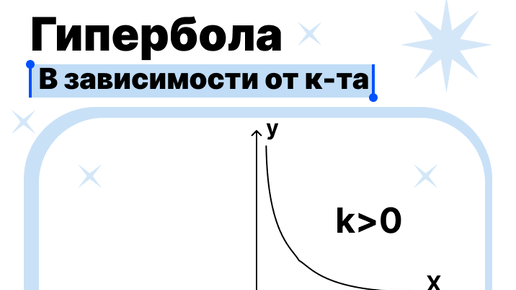 Гипербола — это график функции вида y = k/x, где k ≠ 0 (k — константа, число). Проще говоря: две кривые-ветви, которые никогда не касаются осей координат. Они словно убегают от них навсегда. Как выглядит и почему? 👀 Запомни образ: Это обратная зависимость. Чем БОЛЬШЕ x, тем МЕНЬШЕ y (и наоборот). Поделили фиксированное число k на разные величины. Ключевые свойства 📊 ✔️ Область определения: x — любое число, кроме нуля (на ноль делить нельзя!). D(y): x ∈(-∞; 0) ∪ (0; +∞)...