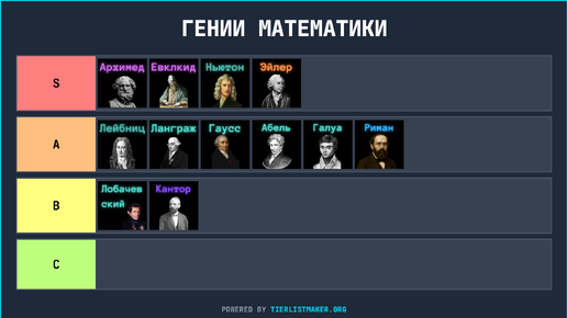 Всем привет! В этом посте я разберу достижения как известных, так и менее популярных математиков и поделюсь своим взглядом на каждого из них. Тир-лист математиков - это не попытка определить, кто из них лучше. Даже те, кто окажется внизу списка, для меня абслютные гении. Цель поста — познакомить вас с разными математиками, напомнить о тех, о ком вы могли не знать, и просто расширить представление о мире математики. Проводим розыгрыши с призами за решение задач, разбираем глубокие разделы математики...
