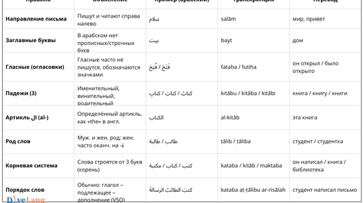 Арабский язык может показаться сложным, но если выделить самые важные правила, то освоить базовую грамматику можно буквально за несколько минут. Эта статья поможет начинающим понять, с чего начать, какие основы знать и как их запомнить. 1. Чтение и письмо справа налево В арабском пишут и читают справа налево. Буквы меняют форму в зависимости от позиции (в начале, середине или конце слова). 👉 Пример: Как запомнить: попробуйте тренироваться каждый день хотя бы с 3–5 новыми словами. 2. Нет заглавных букв В арабском языке нет прописных и строчных букв...