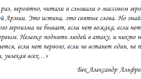 Во многих произведениях раскрываются многочисленные правдивые детали эпизодов Великой Отечественной войны. Один из писателей ХХ века А. Бек рассматривает вопрос о роли командира во время войны. Начиная размышлять о массовом героизме людей в Красной армии, автор уточняет не только то, что это истинные слова, но и то, что важнейшую роль играл человек, поднимающий солдат в атаку. Это может быть и не командир. Он приводит пример гибели двух красноармейцев: Бурнашева и Букеева. Больше никто не пытался...