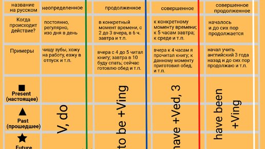Времена английского глагола кажется одной из самых сложных грамматических тем. Целых 12 времен против трех в русском языке — как разобраться, как понять, какое именно и в каком случае использовать? На самом деле все не так страшно, как может показаться на первый взгляд. Главное — понять логику и придерживаться определенного алгоритма. Мы подготовили несложную инструкцию и чек-лист для работы с временами английского. Главное о временах английского глагола Откроем секрет — в английском также всего три времени...