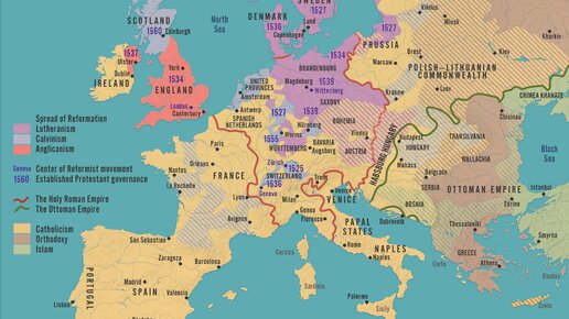 Карта распространения религий в 16 веке.