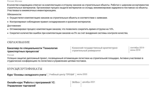 Пример резюме Кладовщика на строительный объект 2025 - Как составить