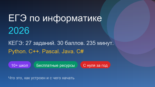 ЕГЭ по информатике с 2021 года сдается в компьютерном формате и называется КЕГЭ. В 2026 году экзамен включает 27 заданий, максимум 30 первичных баллов, длится 3 часа 55 минут (235 минут) и проверяет не только теорию, но и умение писать программы на одном из пяти языков - Python, C++, Pascal, Java или С#. Если вы ищете курсы подготовки к ЕГЭ по информатике или хотите разобраться, реально ли подготовиться с нуля за год, этот материал закрывает все базовые вопросы: что сдают, какие задания, какие темы, как выбрать язык, сколько готовиться, куда поступить и где учиться без лишних трат...