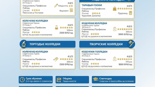 Колледжи Гродно: специальности (технические, медицинские, торговли, творческие), цены (1500-3500 BYN/год), обучение (2-4 года), рейтинги (4.