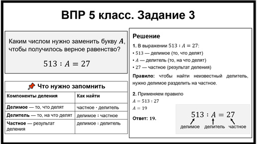 Разбор задания ВПР по математике 5 класс: как найти неизвестный делитель в уравнении 513 : A = 27. 📌 Условие: