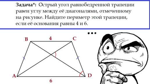 Приветствую вас, друзья! Сегодня в чате репетиторов в telegram скинули интересную задачку по геометрии. С одной стороны, уровень сложности ~ 7 класс, с другой стороны у некоторых репетиторов возникли проблемы с её решением. Давайте попробуем разобраться вместе :) Задача Острый угол равнобедренной трапеции равен углу между её диагоналями, отмеченному на рисунке. Найдите периметр этой трапеции, если её основания равны 4 и 6. Решение: Здесь многим может показаться, что в условии недостаточно данных для решения задачи...