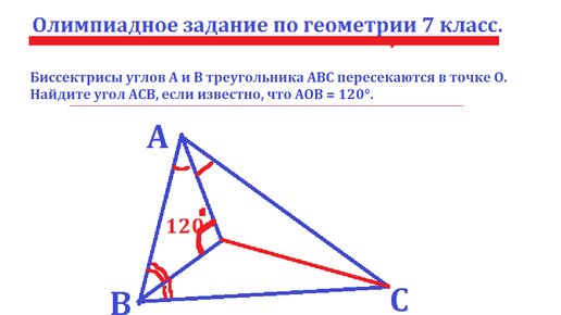 Приветствую читателей и подписчиков канала Тесты_математика! Рассмотрим одну тз олимпиадных задач по геометрии. для учащихся 7 класса. Задача интересна не только для учащихся 7 класс, но и для старшеклассников. Олимпиадное задание по геометрии 7 класс. Биссектрисы углов А и В треугольника АВС пересекаются в точке О. Найдите угол АСВ, если известно, что АОВ = 120°. В этой галерее рисунков можно найти начало решения задачи очень простым способом...
