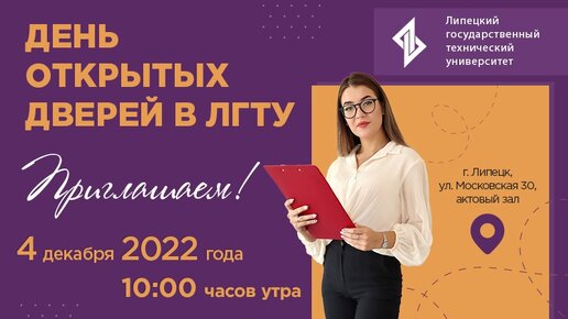 Липецкий государственный технический университет приглашает выпускников школ, колледжей и их родителей 4 декабря 2022 года в 10:00 по адресу г. Липецк, ул. Московская, 30, актовый зал.