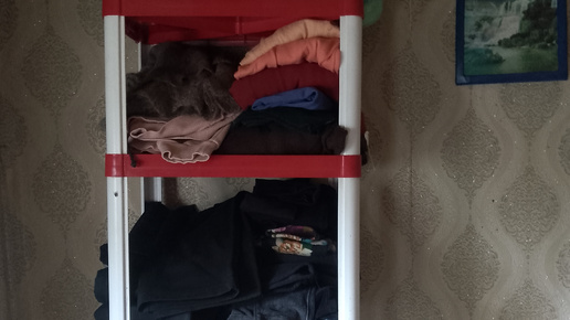 Дом у меня маленький. Гардероб стоит в кладовке с ним дом и продавался. Он, гардероб, старый советских времён ещё. Лакированный без зеркала. Как его в кладовку тесную затащили для меня секрет. Новый я купить не могу, а эту махину смысла нет затаскивать. Живём без гардероба в доме. На такие стойки складываем вещи. Вчера летние убрали в кладовку, чтобы не мешали и место не занимали. Оставили кое что, что будет носиться. Куртки так висят. Есть и ещё одна вешалка. Обувь на обувнице. Вполне всё аккуратно и под рукой нужное...