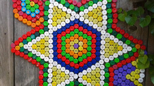 Из пробок от пластиковых бутылок своими руками можно делать и более практичные вещи, например, коврик для прихожей или ванной, способный поднять настроение своим видом. Особенно интересно он будет смотреться, если для его изготовления использовать разноцветные крышки. Нам необходимо: - Разноцветные крышки - Шило - Толстая леска.
