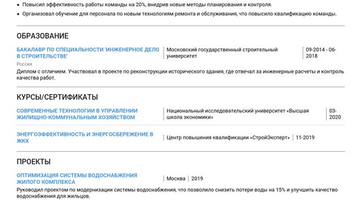 Пример резюме мастера ЖКХ — это ваш практический инструмент для успешного трудоустройства в сфере ЖКХ. Изучите этот готовый пример, чтобы составить эффективное резюме, которое поможет быстро найти работу. 🛠️ На этой странице вы найдете готовые примеры резюме мастера ЖКХ, подходящие как для начинающих, так и для опытных специалистов. Мы даем пошаговые инструкции по заполнению каждого раздела, включая , учитывая требования работодателей и показывая, как адаптировать резюме под разные вакансии. Изучив пример, вы сможете создать резюме с помощью нашего конструктора резюме...