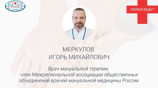 В АО «Медицина» (клиника академика Ройтберга) прием пациентов ведет Меркулов Игорь Михайлович - врач мануальной терапии, член Межрегиональной ассоциации общественных объединений врачей мануальной медицины России.