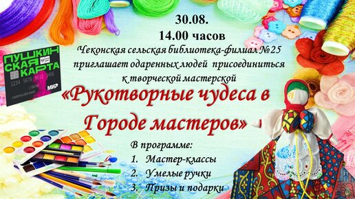 Рукотворные чудеса в «Городе мастеров» (конкурс декоративно-прикладного творчества) «Город мастеров" — конкурс, направленный на популяризацию прикладного творчества. В программе мероприятия представлены различные мастер-классы, а также, народные игры и сказки от деда-краеведа Участники мастер-классов смогут познакомиться с техникой декупажа, оригами, лоскутное шитье, фоамиран,...