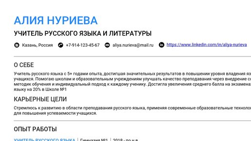 Пример резюме учителя русского языка поможет вам понять, как составить эффективное резюме. Изучение готовых примеров — лучший способ приблизиться к получению желаемой работы ✨. На странице представлены готовые примеры резюме учителя русского языка и пошаговые инструкции по каждому разделу. Вы узнаете, как лучше описать учитывая требования работодателей и актуальные тенденции. Мы предлагаем полезные советы для начинающих и опытных специалистов. Изучив пример, вы сможете создать резюме с помощью нашего конструктора резюме...