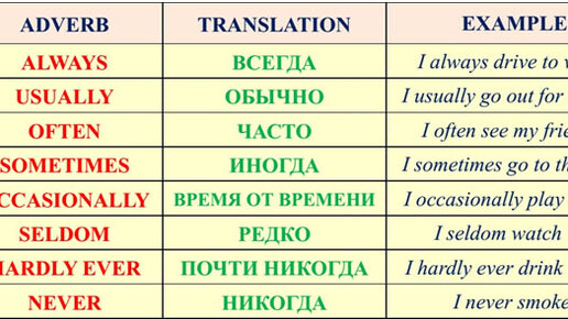 Когда нам нужно обозначить, как часто происходит то или иное событие, мы используем так называемы наречия частоты. Чтобы разом выучить все английские слова данной группы, предлагаю вашему вниманию наглядную табличку: С помощью этих 8 наречий вы можете описать любую ситуацию, которая требует упоминания частоты того или иного действия...