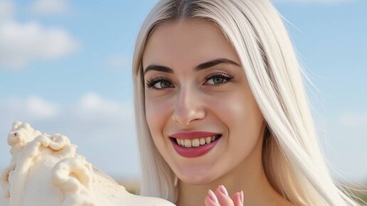*¨༺ ПРОМТИК ༻¨* На снимке изображена молодая женщина, широко улыбающаяся на фоне открытого неба и держащая в руках большую белую морскую раковину. Описание: - Одежда: На человеке объемный свитер нежно-голубого цвета, связанный из мягкой фактурной пряжи. Рукава длинные, слегка свободного кроя, подчеркивающие комфорт и уют. - Руки: Кисти нежно обхватывают ракушку, придавая происходящему трогательное и естественное настроение. Изящные пальцы с мягкими движениями подчеркивают нежность их соприкосновения с текстурой ракушки...