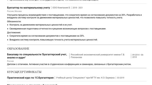 Изучение готового примера резюме бухгалтера по материальному учету — лучший способ понять, как составить действительно эффективное резюме. Используйте этот пример как основу для создания документа, который поможет получить желаемую работу. 💪 В нашей статье вы найдете все необходимое, чтобы шаг за шагом создать идеальное резюме бухгалтера. Мы разберем ключевые разделы и покажем, как правильно представить ваш опыт и навыки: Изучив пример, вы сможете создать резюме с помощью нашего конструктора резюме...