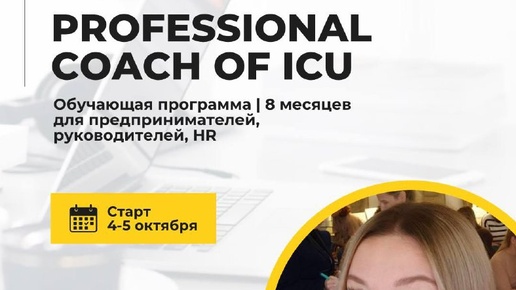 ОБУЧАЮЩАЯ ПРОГРАММА 🥇 PROFESSIONAL COACH OF ICU ▶️Старт 4-5 октября (сб-вс) Международный союз коучей ICU запускает в Краснодаре программу - ✔️ 8 месяцев обучения, которое меняет мышление и инструменты управления. Это будет ценно для ▶️ предпринимателей, которые хотят масштабировать бизнес ▶️ руководителей и HR, уставших «тянуть команду» и ищущих рабочие инструменты мотивации ▶️ специалистов, которым важно добавить к профессии новые сильные методы (психологи, тренеры, консультанты). В программе вы получите: ⏺ 70% практики: реальные кейсы, демо-сессии, работа с наставником...