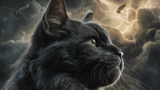 Если хотите почитать где я люблю работать с ии, вам сюда. Огромный тёмно-серый кот породы мейкун, состоящий из облаков в которых сверкают молнии, на фоне гор и соснового леса. Солнце пробивается сквозь тёмные облака. Гиперреализм, высокое разрешение, высокая детализация, портрет в полный рост. Вокруг кружат маленькие птицы. Рендер в Octane, 3D-рендеринг, кинематографическое и атмосферное освещение, ночное небо. Фэнтезийный художественный стиль, чёрный мех. Изображение выполнено в стиле фэнтези-арта...