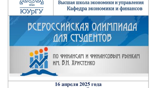 Подведены итоги первого (дистанционного) тура Всероссийской олимпиады для студентов по финансам и финансовым рынкам им Б.Н. Христенко за 2024-2025 уч. год. Победителями стали Фамилия Имя Оценка/30 Университет Демьяник Роман 30 ЮУрГУ Худякова Ксения 30 ЮУрГУ Антоненко Максим 30 ЮУрГУ Богатырева Анна 30 ЮУрГУ Лысякова Елизавета 30 ЮУрГУ Козаченко Екатерина 30 ЮУрГУ Яланецкий Евгений 30 Нижневартовский государственный университет Тептеева Елена 30 ЮУрГУ Скороход Максим 30 ЮУрГУ Мешечкова...