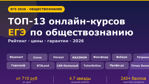 Обществознание - самый массовый предмет по выбору: его сдают более 250 тысяч выпускников ежегодно, а проходной балл на юрфак МГУ, экономфак ВШЭ и управленческие направления РАНХиГС уверенно перевалил за 90. Разобраться в том, какие курсы ЕГЭ обществознание реально готовят на 80+ баллов, а какие просто крутят рекламу, - задача не из легких. Редакция изучила онлайн курсы по обществознанию у 13 крупнейших школ, сверила цены с демоверсией ФИПИ и кодификатором 2026, почитала отзывы на tutortop.ru, sravni...
