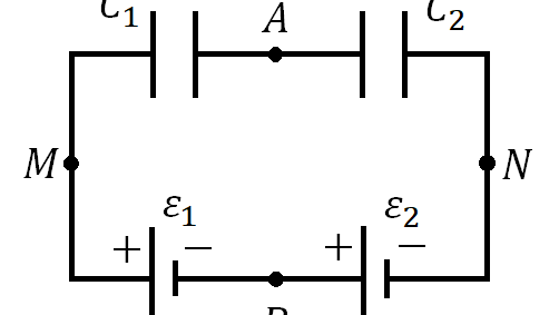Полное условие задачи Определить разность потенциалов между точками A и B в схеме, изображенной на рисунке. Краткое условие задачи Решение задачи Для решения задачи дополнительно проставим точки M и N на схеме: Конденсаторы соединены между собой последовательно, поэтому напряжение на них будет равно разности потенциалов между точками M и N: Из схемы видно, что: Сложим между собой уравнения (2) и (3): С учетом соотношения (1) получаем: Напряжение на первом конденсаторе равно разности потенциалов...