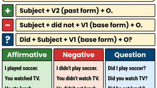 The simple past tense describes actions or situations that started and finished at a specific point in the past. It’s essential for narrating stories, reporting events, describing past habits, and expressing completed actions. In this lesson, you’ll learn how to form and use the simple past tense in affirmative, negative, and question forms, understand its structure and usage, explore grammar rules, and work with regular and irregular verbs. You’ll also learn how to use common time expressions—all with clear examples...