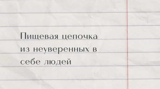 Пищевая цепочка из неуверенных в себе людей Мне кажется, что в мире людей действует та же пищевая цепочка, что и в природе. только там одни съедают других (в прямом смысле этого слова), люди же питаются чужой неуверенностью. Вы наверняка замечали: Даже в случайных ситуациях - в магазине, на улице, в общей компании - ты видишь, как уверенный человек спокойно получает своё, а неуверенный сжимается и уступает. Любая неуверенность становится ресурсом для других: чем больше у тебя сомнений и страха проявить себя, тем шире пространство, где тобой могут пользоваться...