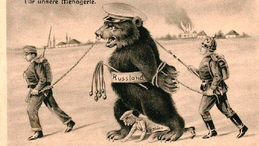 Российские пропагандисты часто изображали своих врагов как жалких карликов, по сравнению с огромными могущественными русскими воинами. Немцы, в свою очередь, любили изображать русских как грязных варваров-бородатых. Русский солдат держит немецких и австрийских солдат за уши, как непослушных детей. Русские солдаты всегда выглядят как нищие, одетые в лохмотья, с пьяным лицом. «Я хочу быть Наполеоном!» - говорит немецкий император Вильгельм II. Мобилизация à la russe : алкоголь вместо солдат...