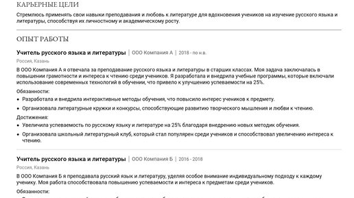 Изучение готового примера резюме педагога русского языка и литературы — лучший способ быстро составить эффективную самопрезентацию 📝. Такой подход значительно увеличивает ваши шансы получить приглашение на собеседование и найти работу мечты ✨. На нашей странице вы найдете . Мы собрали все необходимое, чтобы помочь как начинающим специалистам, так и опытным педагогам составить сильное резюме, отвечающее всем современным стандартам. Изучив пример, вы сможете создать резюме с помощью нашего конструктора резюме...