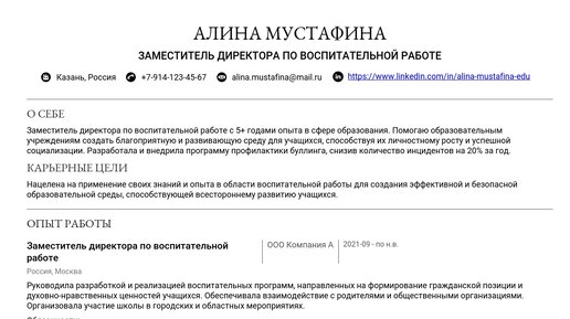 Пример резюме заместителя директора по воспитательной работе 2025
