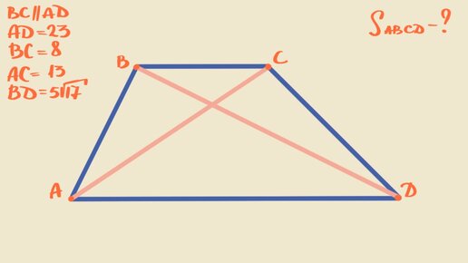 Популярный тип задач с трапецией и одно из самых частых дополнительных построений в трапеции Чаще только высоты проводят и среднюю линию рисуют. Тем не менее такие задачи (как правило) встречаются среди задач посложнее. Для одного из возможных решений нужно: одно доп. построение, один вывод по получившемуся четырёхугольнику (не трапеции) и одна формула площади (Геррона)...