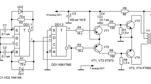 Занимаясь электроникой, мы часто настолько глубоко погружаемся в процесс, что забываем о своём здоровье. А ведь выходить на свежий воздух жизненно важно каждому без исключения! Так почему бы не совместить приятное с полезным? Вот только включить любимый паяльник на улице отнюдь некуда, поэтому и вытекает необходимость в создании простого преобразователя напряжения из 12 в 220 вольт. Схема такого преобразователя показана ниже. Сердцем схемы является микросхема К561ТМ2. На элементе DD1.1 собран генератор частоты на 100 Гц...
