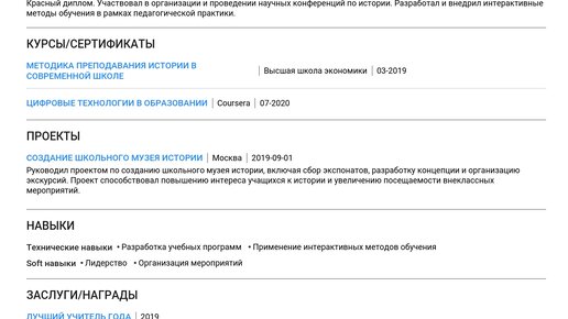 Пример резюме преподавателя истории – ваш надежный ориентир в процессе создания документа, который по-настоящему заинтересует работодателя. Изучение готовых примеров поможет вам составить эффективное резюме, ведущее к успешному поиску и получению желаемой работы в сфере образования. Здесь вы найдете не просто один готовый пример резюме преподавателя истории, а детальную пошаговую инструкцию по подготовке каждого его раздела. Мы подробно расскажем, как правильно представить ваш опыт работы, образование, актуальные навыки и даже раздел "О себе", учитывая специфические требования работодателей ...