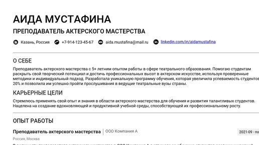 Пример резюме преподавателя актерского мастерства 2025 - Как составить
