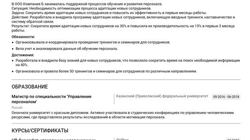 Изучение примера резюме специалиста по развитию персонала — лучший способ быстро понять, как составить эффективный документ. Правильно составленное резюме значительно увеличивает ваши шансы получить приглашение на собеседование и найти работу мечты. Наша статья представляет собой детальное руководство, основанное на готовых примерах и актуальных данных. Вы узнаете: Это поможет вам создать по-настоящему эффективное резюме. Руководство подойдет как начинающим, так и опытным специалистам, а после изучения примера вы сможете создать документ с помощью нашего конструктора резюме...